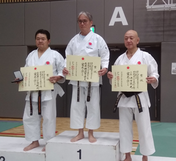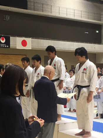 | 平成27年11月14日(土) 日本空手協会総本部主催の「第15回熟練者空手道選手権大会」が文京スポーツセンターにて開催されました。 大会結果は、下記のとおり ![]() ○団体戦「千葉県本部」・・・第3位 先鋒 田中 準也(松戸支部) 次鋒 水谷 大敬(富津支部 濤心館) 中堅 上山 道憲(作新台支部) 副将 冨永 義一(松戸支部) 大将 庄司 快栄(富津支部 濤心館) ○個人戦 水谷 大敬 45歳形の部 準優勝・組手の部 ベスト8 阿部 進一 55歳形の部 第7位 池田 欣也 60歳形の部 準優勝 庄司 快栄 60歳形の部 第5位・組手の部 ベスト8 |