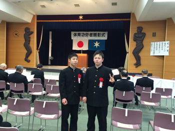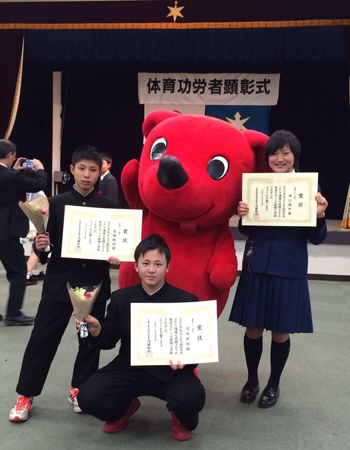 | 平成28年2月15日(月) 平成27年度 千葉県体育功労者等顕彰式が開催しました。 新千葉県本部より千葉県の教育課に対し、該当者の推薦をしましたところ 富津支部 濤心館所属の 羽石 武将 高橋 飛羽 の2名が見事、優秀スポーツ選手として受賞しました。 おめでとうございます。 ![]() ![]() ![]() 千葉県本部ホームページでは、受賞等の様子を掲載いたしますので受賞されました方は、 事務局の加藤までご連絡ください。 |