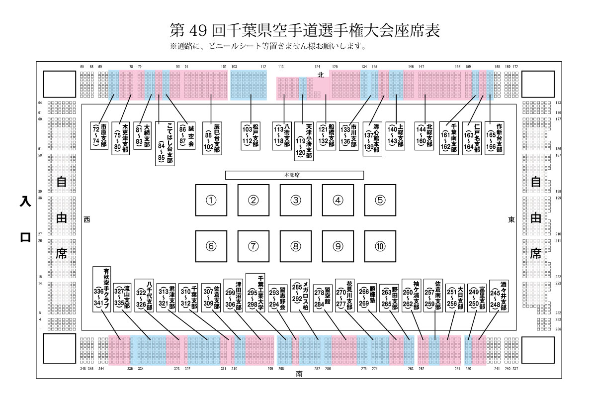 座席は例年とおり、各支部・団体ごとに割振りしていますが、応援の際には座席を移動し応援をしてください。