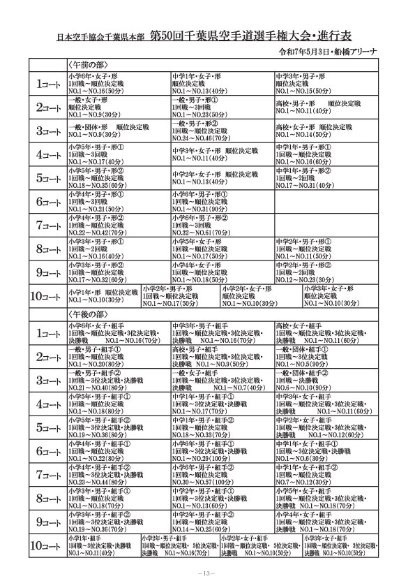 開会式直後の<形の部>ならびに表彰式(形の部)終了後の<組手の部>に出場する各カテゴリーの出場者は、該当コートに直接集合となります(各コート係が招集します)ので、速やかな移動をお願いします。